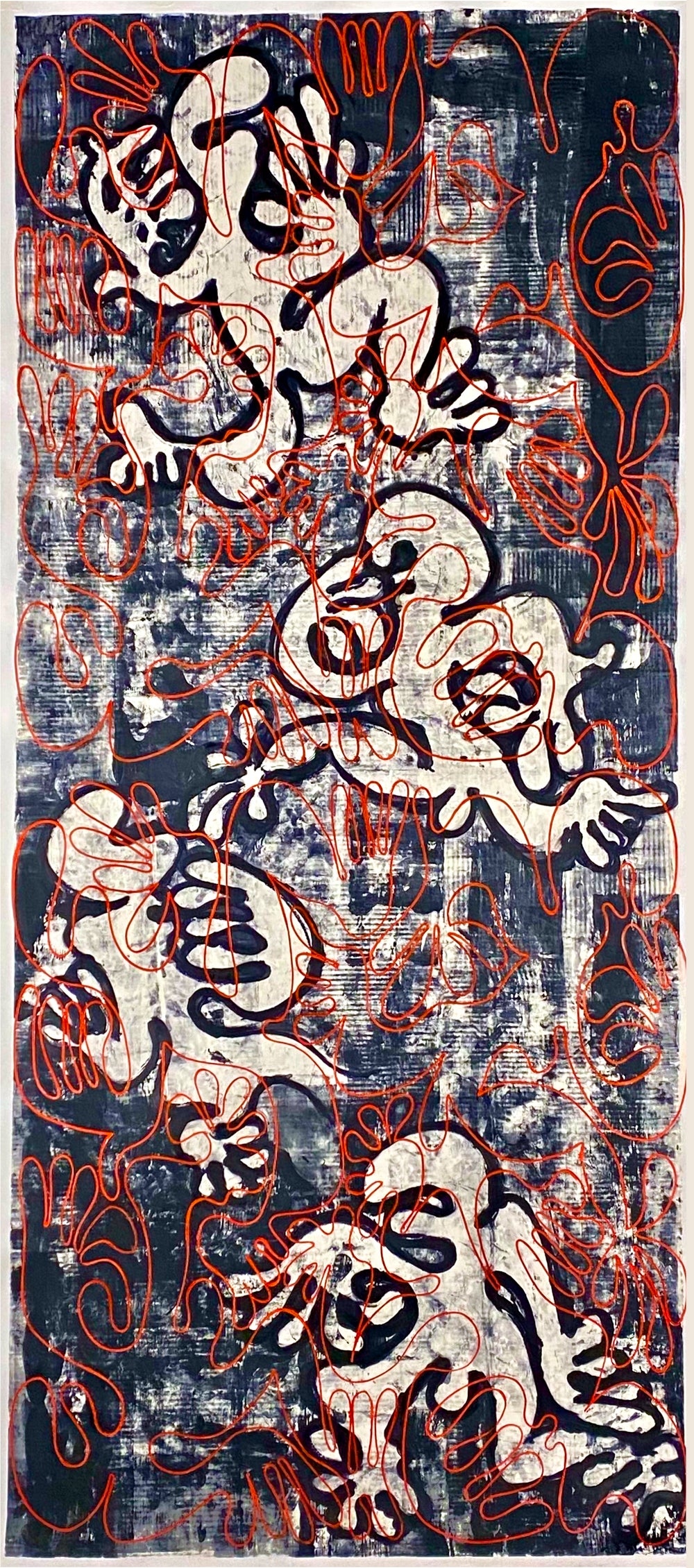 The technique implemented through the editions I first employed in the late 1980s. This includes, hand printed mono prints using a custom, hand built printing press which uses my automobile to apply pressure with incredible accuracy. In addition, silkscreen, dry point etching and techniques I learned first hand working at Mixografia in east Los Angeles. Painted at the Texas and Manhattan studios.