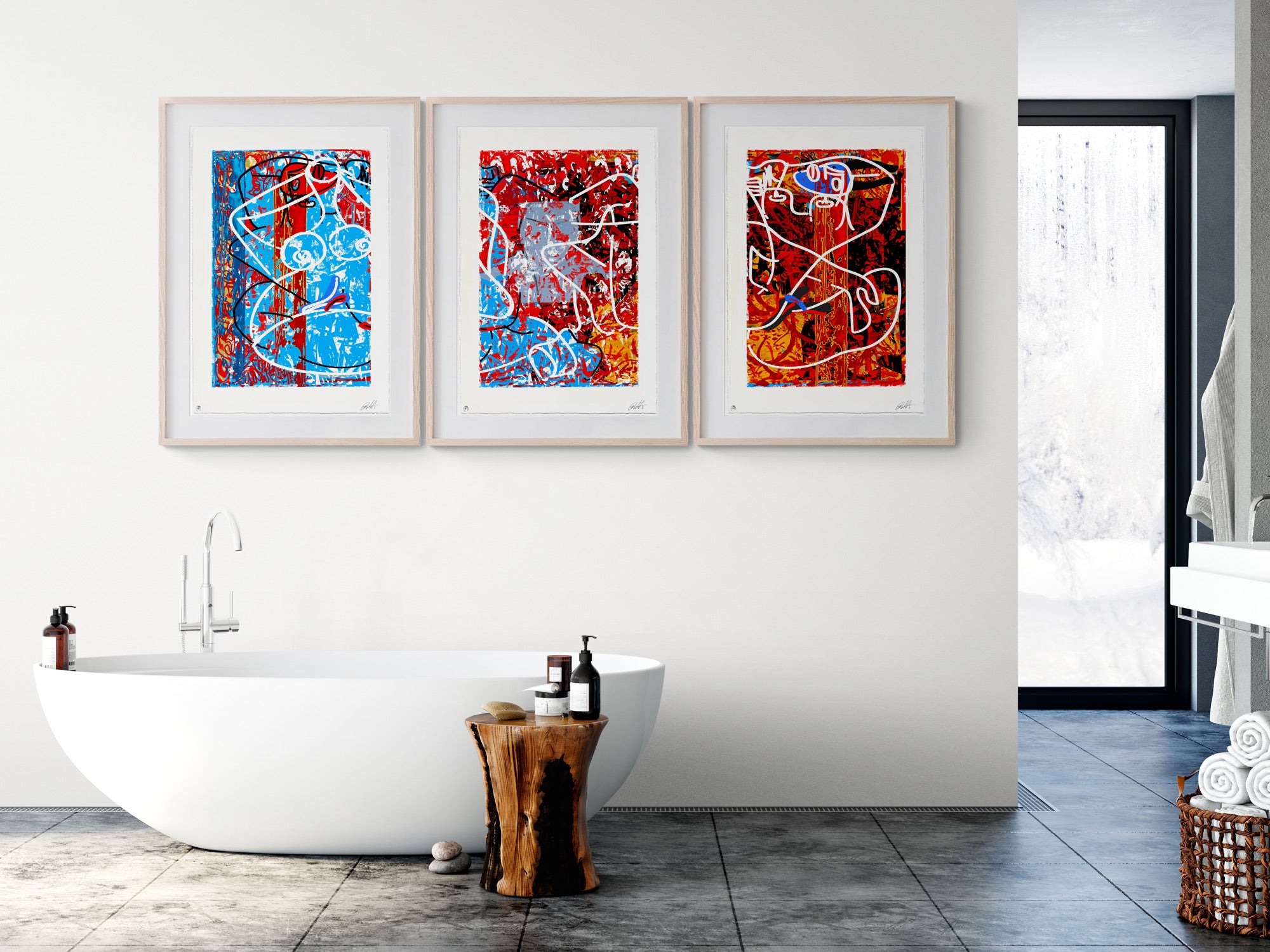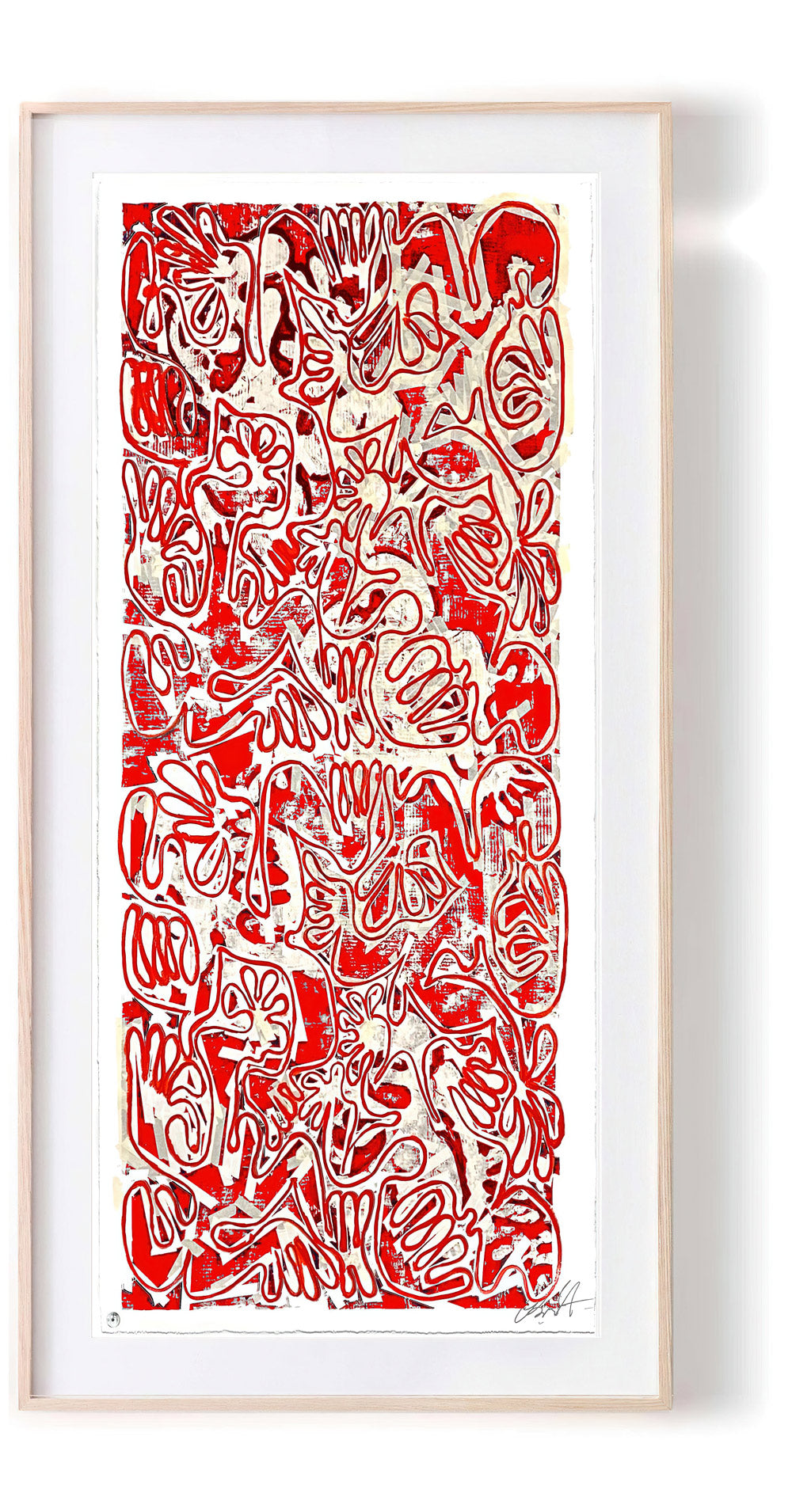 The technique implemented through the editions I first employed in the late 1980s. This includes, hand printed mono prints using a custom, hand built printing press which uses my automobile to apply pressure with incredible accuracy. In addition, silkscreen, dry point etching and techniques I learned first hand working at Mixografia in east Los Angeles